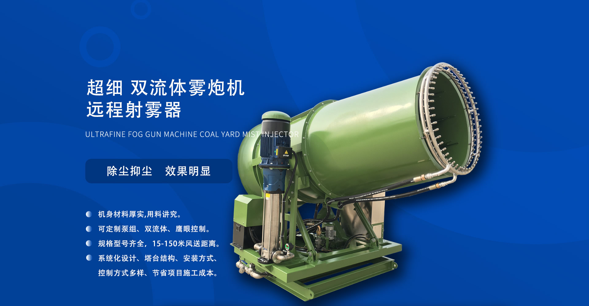 双流体射雾器系统广泛适用于港口、火电厂、钢铁厂、矿场、化工厂等无组织排放场所固定污染源的密闭或半密闭空间抑尘 除尘效果就是好,降尘效率高。