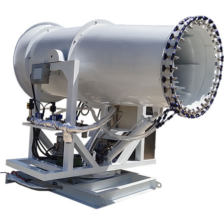 产品简介:80米远程雾炮机(射雾器),主要应用于大型堆料区,该型设备整机功率约50kw,整机自重约1.8吨。可通过重型无线遥控器实现控制,也可通过上位机(电脑、手机)等远程集中控制,实现无人值守、故障反馈、自动启停等。